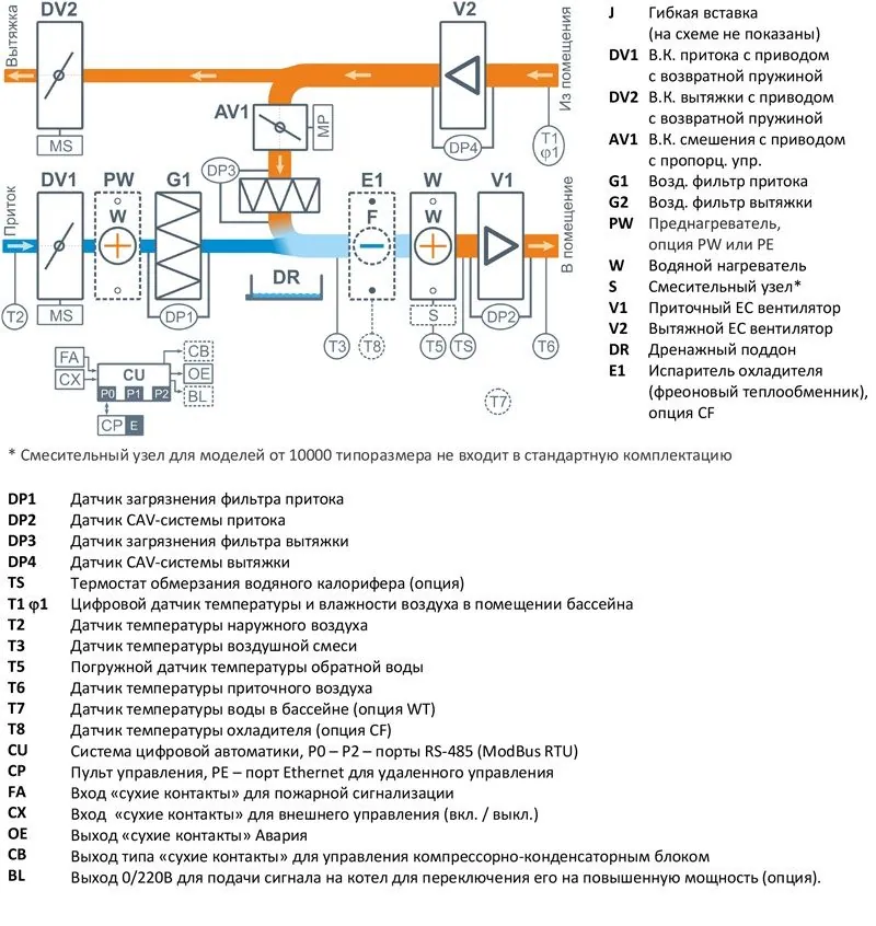Агрессивная воздушная среда бассейна приводит к коррозии внутренних необработанных металлических поверхностей вентустановки. Поэтому оборудование для помещений бассейнов имеет специальную антикоррозионную защиту.